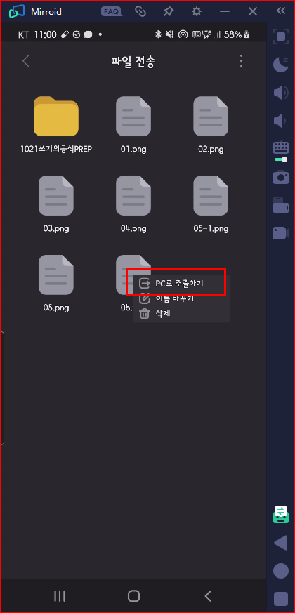 이번에는 반대 상황, 스마트폰 파일을 컴퓨터로 전송하는 방법을 알아보겠습니다. 우선 스마트폰에서 복사할 파일을 선택합니다. 길게 누르면 팝업 메뉴가 나옵니다. 팝업 메뉴란 마우스가 위치한 장소에서 필요한 메뉴가 튀어나오는 것을 말합니다. Popup이라는 의미가 그런 것 아니겠어요. [PC로 추출하기], [이름 바꾸기], [삭제] 등 메뉴가 튀어나옵니다. 여기서 복사하는 경우는 [PC로 추출하기]를 선택합니다.