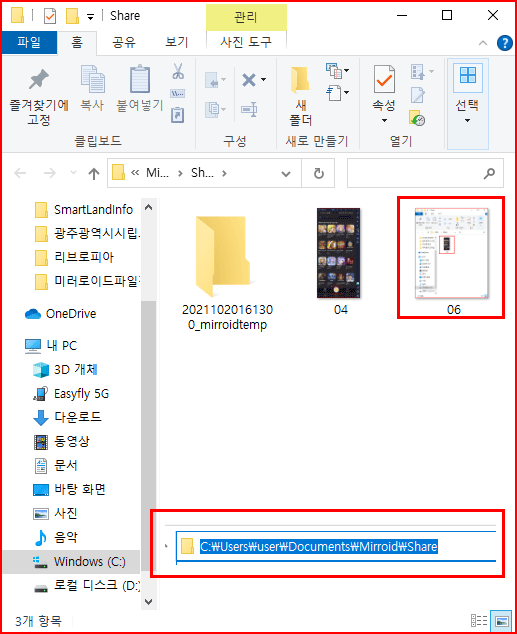 위 이미지의 주소는 [C:\Users\user\Documents\Mirroid\Share\06.png]가 되겠습니다. 컴퓨터의 환경에 따라 다른데 대체로 자신의 사용자방 문서 폴더에 [Mirroid] 폴더가 생기고 [Share] 폴더 안에 복사됩니다. 즉 미러로이드에 의해 추출되어 공유하고 있다는 의미의 폴더가 되겠습니다.