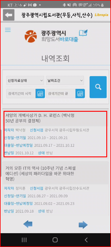 제가 마지막으로 신청했던 도서는 [서양의 개벽사상가 D. H. 로런스(백낙청 50년 공부의 결정체)]였군요. 이 책을 제가 9월 10일 신청했고, 서점에서 대여받은 날은 9월 17일, 반납한 날은 10월 12일이었습니다.