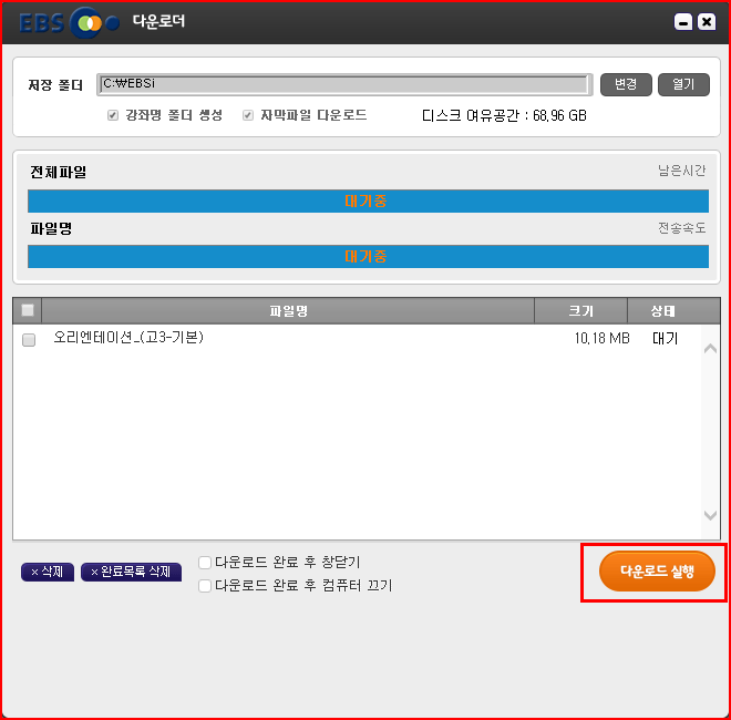 컴퓨터에서 파일을 다운로드하는 경우에는 EBS에서 제공하는 다운로더를 통해 제어할 수 있습니다. [다운로드 실행]을 통해 다운로드가 시작됩니다. 다운로드 중에 [일시정지]를 눌러 도중에 중지할 수 있습니다. 불필요한 파일을 삭제할 수도 있습니다.