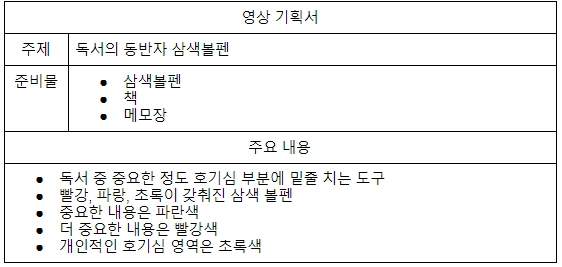 이 시간은 자신의 애장물을 소개하는 시간입니다. 저는 삼색볼펜을 소개하기로 결정했습니다. 독서를 할때 색을 구분해서 밑줄을 긋거나 메모를 해두면 효과적으로 책의 내용을 파악할 수 있습니다. 특히 학교를 다니는 학생들의 경우는 반복학습에 큰 효과를 볼 수 있습니다.