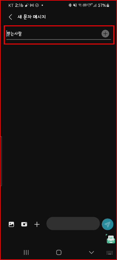 메시지 어플을 선택합니다. 새 메시지 작성을 위한 아이콘을 클릭하면 아래와 같은 [새 문자 메시지] 작성을 위한 창이 열립니다. [받는사람]란에 전화번호를 기록하거나 주소록 명단을 검색하여 추가합니다. 그 과정에서 [+]기호를 눌러 추가를 계속하게 됩니다. 아래 사례에서는 16사람이 추가된 결과가 보입니다.