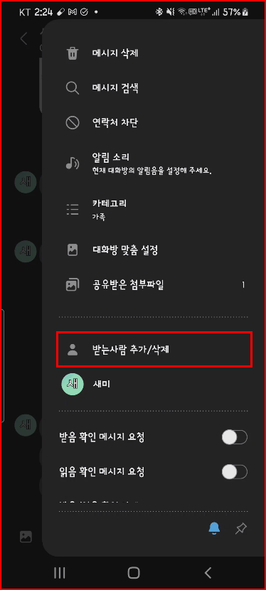 그러나 상황에 따라 나타나는 화면은 각기 다릅니다. 바로 답장을 하려는데 다른 사람을 선택하여 단체로 문자를 보내고 싶다면 오른쪽 위 [세점 더보기]를 선택합니다. 아래와 같은 메뉴가 뜹니다. 이 가운데 [받는사람 추가/삭제]를 선택하여 추가할 수 있습니다.