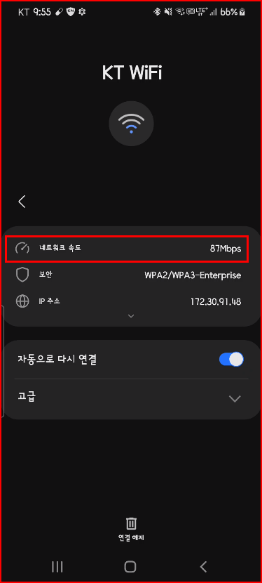 안테나 아이콘을 보면 KT와이파이보다 LG공공와이파이가 수신 상태가 좋군요. 그것만 보고 선택할 수는 없겠군요. 아래 네트워크 속도를 보면 KT는 260Mbps인데 비해 LG는 117Mbps이군요. 물론 이렇게 소속 통신회사의 네트워크 속도가 완연히 높을 때가 있습니다만 경우에 따라서는 낮을 수도 있습니다. 제가 처음 시도했을 때는 LG보다 KT WiFi 속도가 더 낮았습니다. 그때는 와이파이 수신 상태도 두줄이었군요.