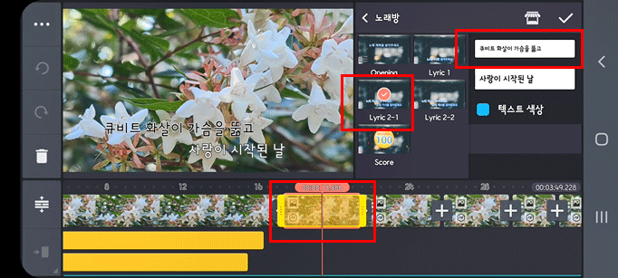 윗줄 가사와 위에 있는 텍스트박스와 일치하고 있지요. 아래 이미지에서 보듯이 아랫줄 가사와 아랫줄 텍스트박스와 일치하게 합니다.