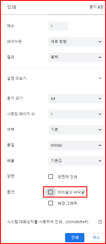 이렇게 인쇄하기 위해서는 인쇄 옵션을 이해해야 합니다. 아래 인쇄 설정에는 용지 크기를 비롯 여러가지 환경을 설정하게 됩니다. 아래에 옵션을 보면 [머리글과 바닥글], [배경 그래픽]을 선택 및 해제할 수 있습니다. 이것을 해제하면 위와같은 출력물을 얻을 수 있습니다. 기본은 [머리글과 바닥글]이 선택된 상태입니다. 저는 그것을 해제하고 출력했습니다.