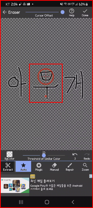 먼저 아래 아이콘 중 [Auto]를 선택합니다. 이 메뉴는 유사한 픽셀을 자동으로 삭제하는 옵션입니다. 이 방법으로 배경 하얀 색깔을 한꺼번에 지울 수 있습니다. 그리고 막혀있는 [ㅇ]과 [ㅁ]은 따로 선택하여 지우면 됩니다.