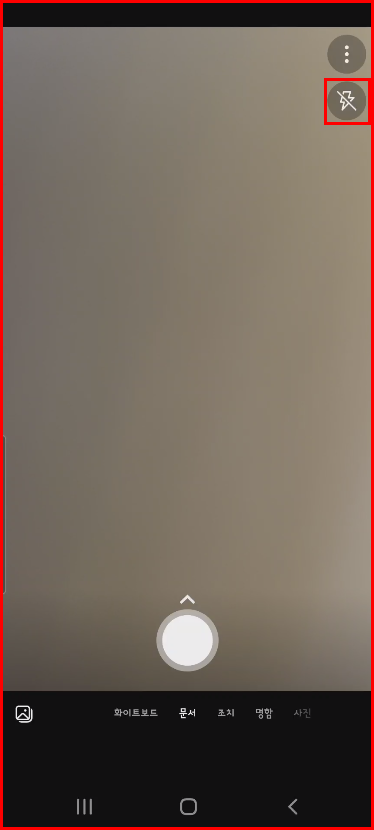 어플을 실행하면 카메라가 켜지면서 스캔 준비가 됩니다. 화면 우상단에 번개 표시가 있는데 이곳에서 플래시를 설정할 수 있습니다. 플래시를 사용하면 신분증 스캔에서는 반사광 때문에 결과물이 좋지 않습니다. 플래시를 사용하지 않고 스캔하는 것이 좋겠네요. 너무 어둡다면 다른 조명을 이용하는 것이 좋지 싶어요. 아래 하얀 동그라미는 스캔할 때 사용되는 버튼입니다.