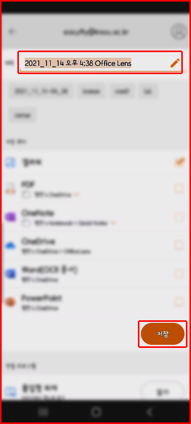 [완료]를 선택하여 스캔 작업을 마칩니다. 이어지는 과정은 저장하는 절차입니다. 저장할 파일 이름 등을 편집할 수도 있습니다. 폴더를 지정하지 않으면 스마트폰의 [Pictures] 폴더의 [Office Lens] 폴더에 저장됩니다.