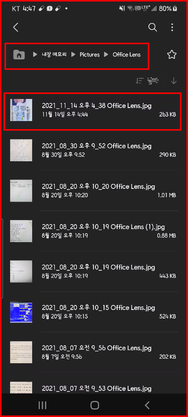 마이크로소프트 Lens 어플은 광고가 없어 작업하는 과정도 깔끔합니다. 스캔된 결과물을 [내파일] 등 파일관리자를 통해 확인하고 사용할 수 있네요.