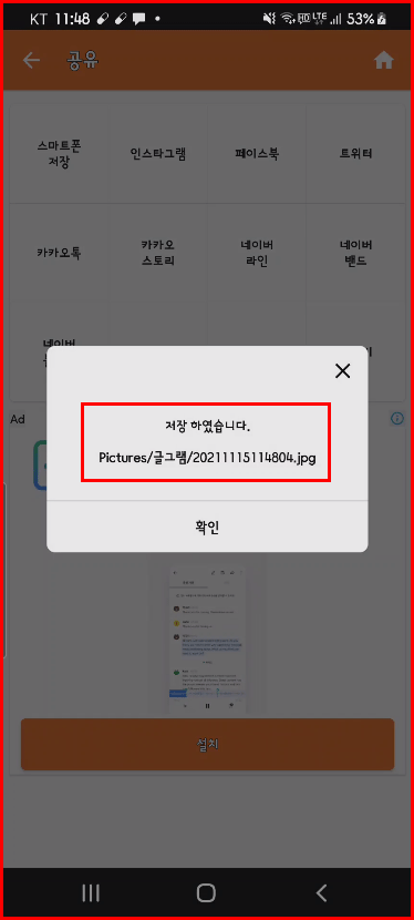 스마트폰에 저장될 파일의 이름과 보관 폴더가 메시지로 팝업 됩니다. 자세히 보니 스마트폰의 [Pictures] 폴더의 [글그램] 폴더 아래 [~~~.jpg]로 저장된다고 나오네요. [확인]하여 저장을 끝냅니다.