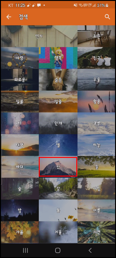 | 여러 범주 중 [산] 선택 | [산] 배경 사진 중에 집이 있는 풍경 선택 |