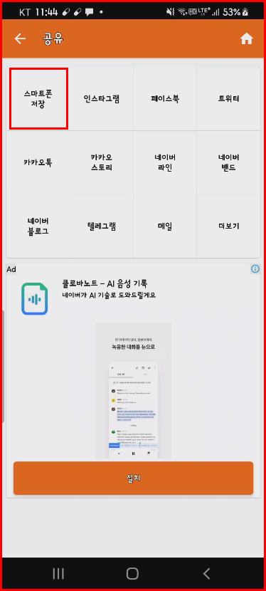 글을 완성했다고 글그램에 알리는 오른쪽 위 체크를 클릭하면 [저장] 버튼이 나옵니다. 저장을 하면 완성된 글그램 결과물을 어떻게 활용할 것인가를 묻습니다. 저는 사용 중인 스마트폰에 저장하여 사용하겠습니다. 글그램이 주로 SNS에 사용되는 카드 제작용이라 여기서 바로 인스타그램이나 페이스북 등에 보낼 수 있습니다. 스마트폰에 저장하면 보관된 이미지를 적절한 용도로 사용할 수 있습니다.