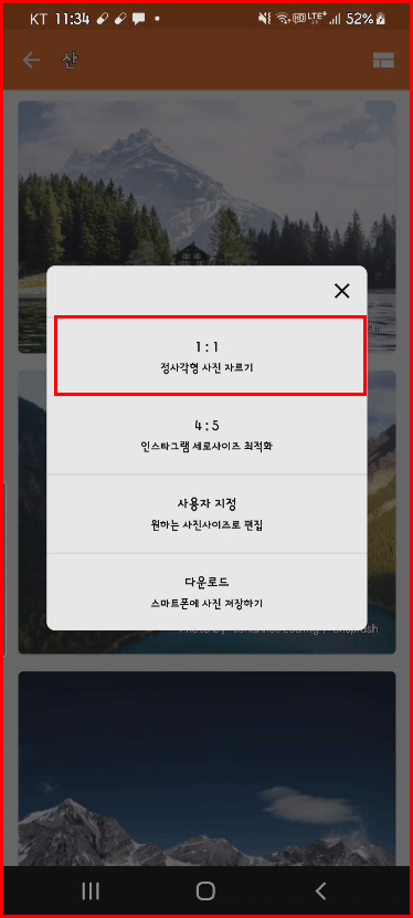글을 작성할 배경으로 선택한 이미지를 클릭하면 다음과 같이 열립니다. 배경으로 사용할 사진을 어떤 구도를 적용할지를 고릅니다. 여기서는 썸네일에 사용되는 것이기에 [1:1] 정사각형으로 사진을 잘라 쓰겠습니다.
