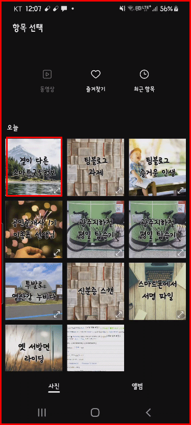 앨범에서 선택한다는 것은 바로 스마트폰에 있는 사진을 사용한다는 얘기입니다. 글그램으로 작업한 결과물이 스마트폰에 이미지로 저장되어 있거든요.