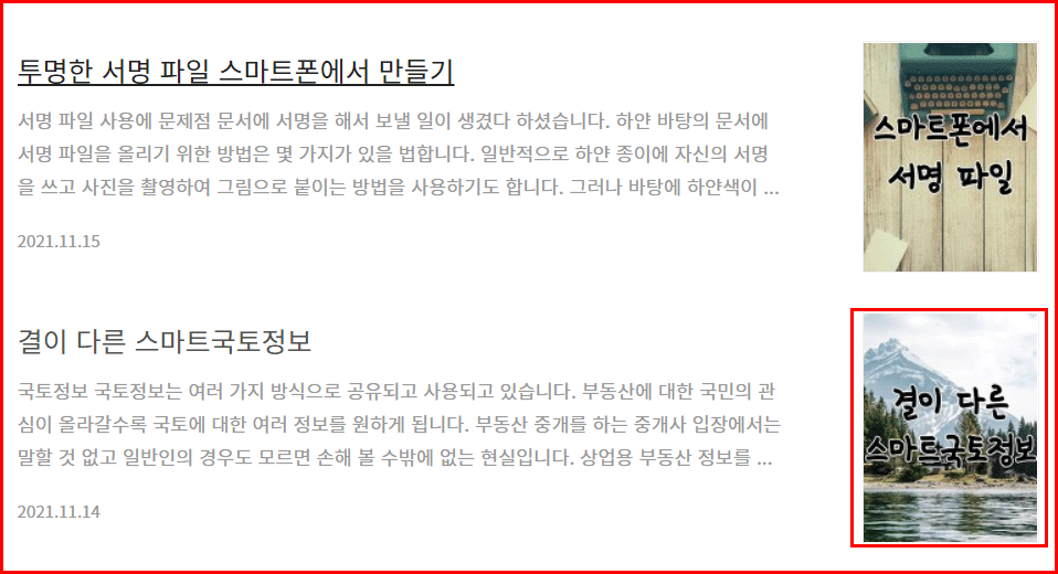 티스토리 목록에는 썸네일이 있습니다. 썸네일은 본문에 실린 이미지 중에 하나가 사용되는 경우가 많습니다. 그러나 따로 썸네일을 등록하면 목록에서 글의 주제를 선명하게 보일 수 있습니다. 아래 이미지에서 첫 번째 썸네일은 따로 등록한 것입니다. 두 번째 목록은 글 내용에 있는 멋대가리 없는 사진이 선택됐습니다. 특별한 지정이 없으면 사용된 이미지 중에서 제일 위에 등록된 이미지가 선택됩니다.