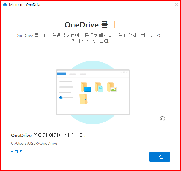 드디어 마이크로소프트에서 제공되는 원드라이브 5GB가 시작됩니다. 클라우드가 로컬 컴퓨터의 어디에 붙게 되는가는 아래 경로가 나옵니다. [C:\Users\USER\OneDrive]라고 떴네요. 만약 위치를 바꾸고 싶으면 그 아래에 있는 [위치 변경]을 선택하여 경로를 변경할 수 있습니다.