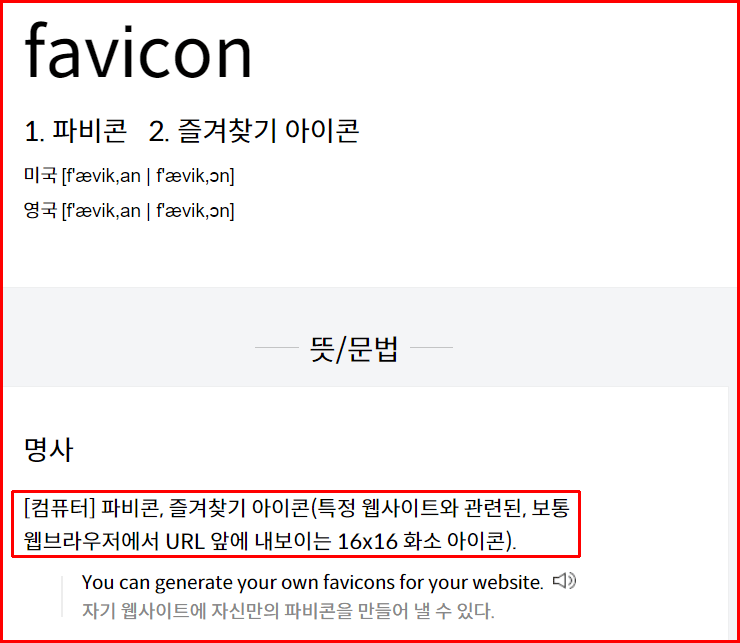파비콘은 영어로 favicon인데 다음 사전에 의할 것 같으면 즐겨찾기 아이콘이라 정의했네요. 특정 웹사이트와 관련된, 보통 웹브라우저에서 URL 앞에 내보이는 16 ×16 화소 아이콘이라고. 아주 작은 아이콘인데 형식이 [~.ico]로 된 파일이랍니다. 아이콘은 [JPG], [GIF], [PNG] 모두 된다는데 파비콘은 [ICO] 확장자의 이미지 파일이라고요.
