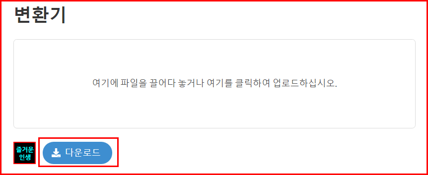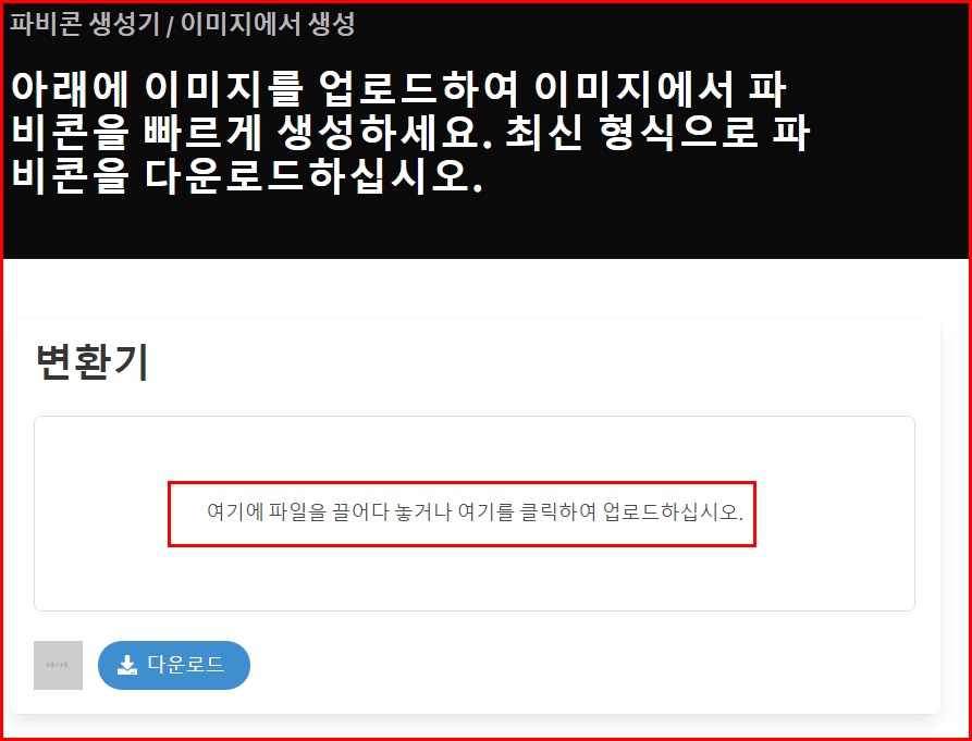 위 이미지를 이용하여 파비콘을 만들기 위해서 이미지에서 파비콘 생성 메뉴를 선택합니다. 다음과 같은 창에 변환기 아래를 클릭하여 파일을 선택하던지, 마우스로 이미지를 끌어올리던지 하면 됩니다. 저는 클릭하여 이미지를 선택했습니다.