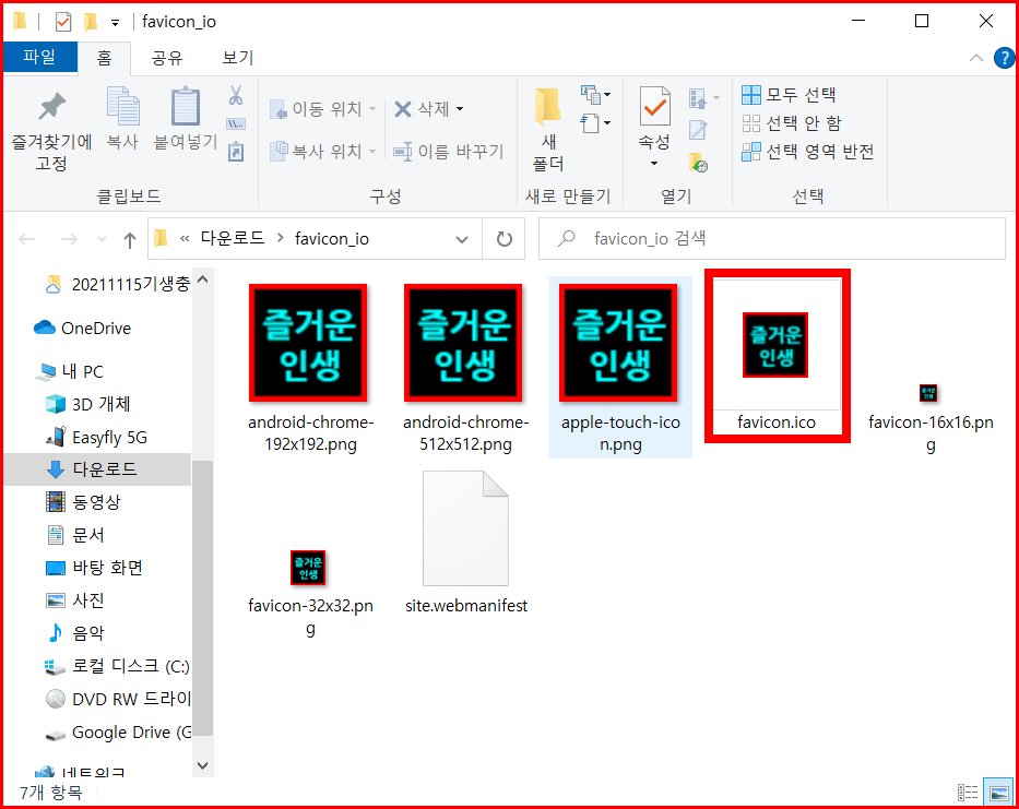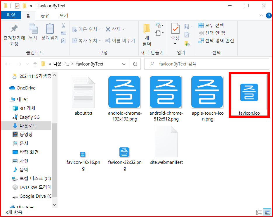 역시 이미지로 만들 때와 마찬가지로 압축파일로 내려받습니다. 이것을 풀어보니 이미지에서 받은 것과 동일한 종류의 아이콘과 파비콘이 만들어졌군요.