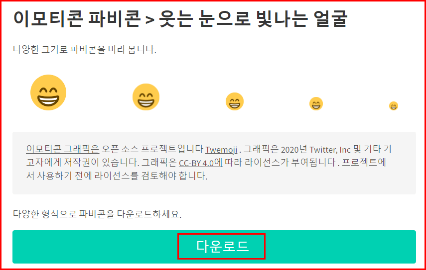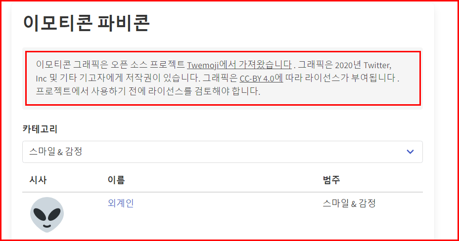 오픈 소스 프로젝트인 Twemoji에서 제공된 이모지를 파비콘으로 사용할 수 있는 방법입니다. 사용하기 전에 라이선스를 검토하라는 당부가 있네요.