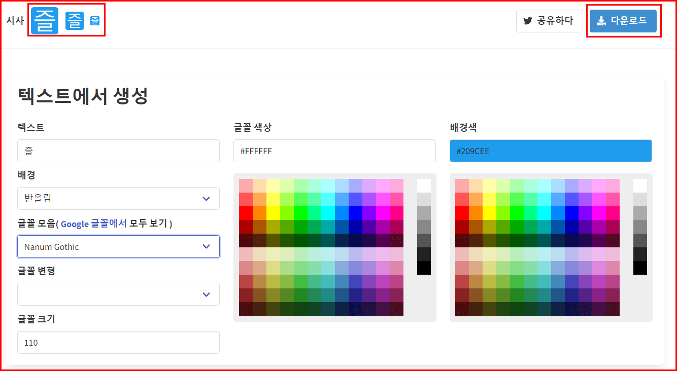 텍스트는 [즐], 글꼴 색은 하얀색, 배경색은 [#209CEE]. 글꼴은 나눔고딕을 선택하고 다운로드 버튼으로 내려받습니다.