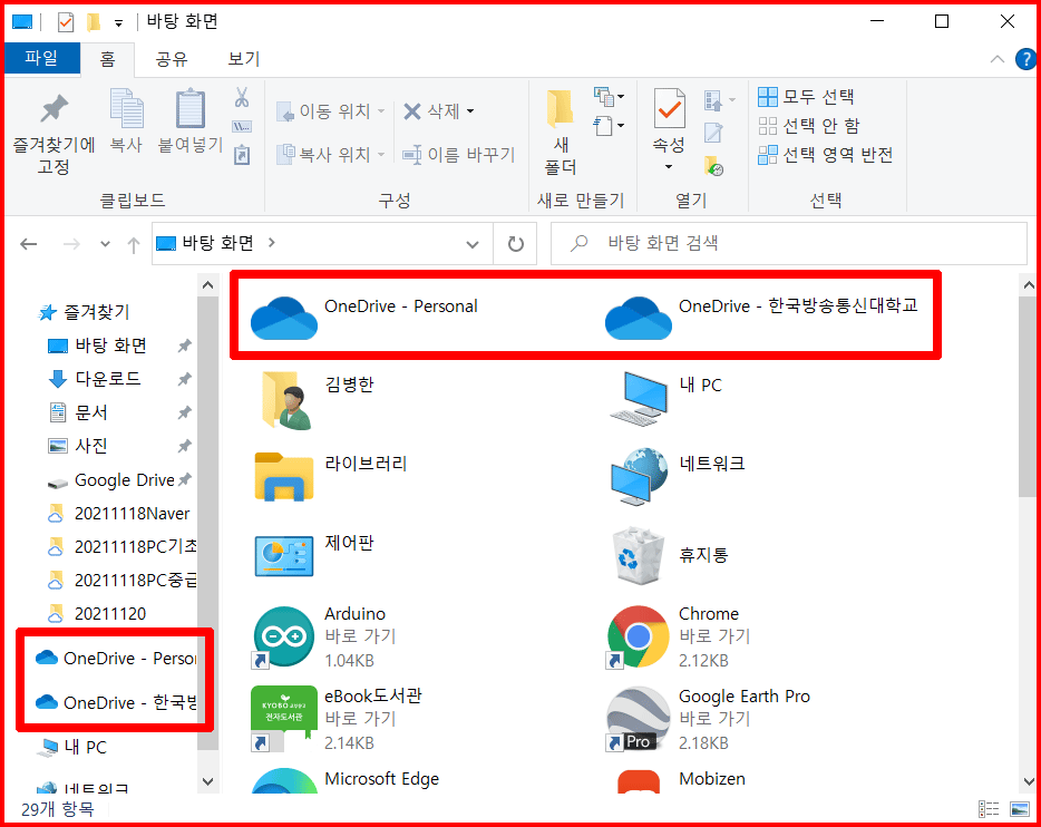 이렇게 자신의 개인 계정과 학교 계정, 두 개가 연결되어 사용되는 것을 탐색창의 다른 방식으로 소개를 이어 가겠습니다. 컴퓨터의 사용자 폴더 자신의 방에 두 개 OneDrive가 연결되어 있습니다.