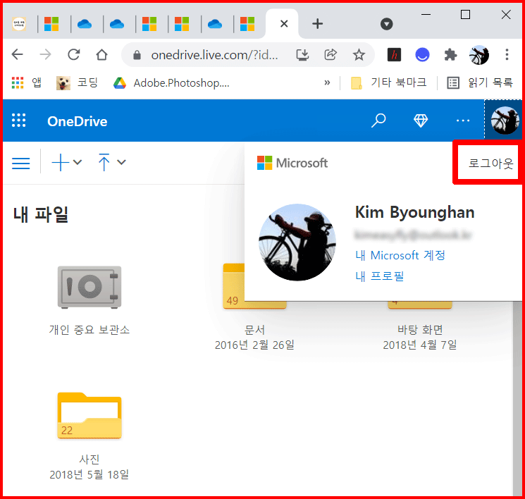 자신의 컴퓨터가 아닌 공용 컴퓨터나 타인의 PC는 최종적으로 원드라이브 연결을 끊어야 합니다. 연결을 끊는 것은 브라우저에서 가능합니다. 웹브라우저(크롬 또는 엣지 모두 가능)에서 마이크로소프트 원드라이브에 접속합니다. 접속된 상태에서 오른쪽 프로필을 선택하면 [로그아웃]을 할 수 있습니다. 여기서 연결을 끊어야 최종적으로 OneDrive가 끝납니다.