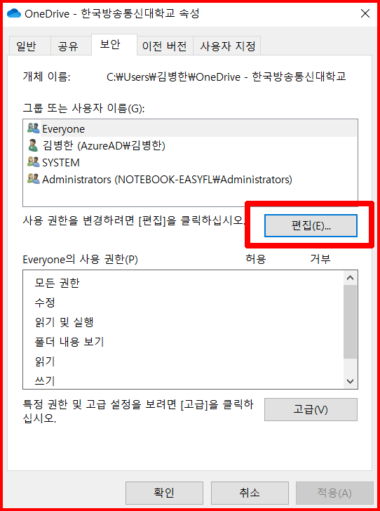 C:\Users\d아무개\OneDrive | C:\Users\아무개\OneDrive-한국방송통신대학교 |