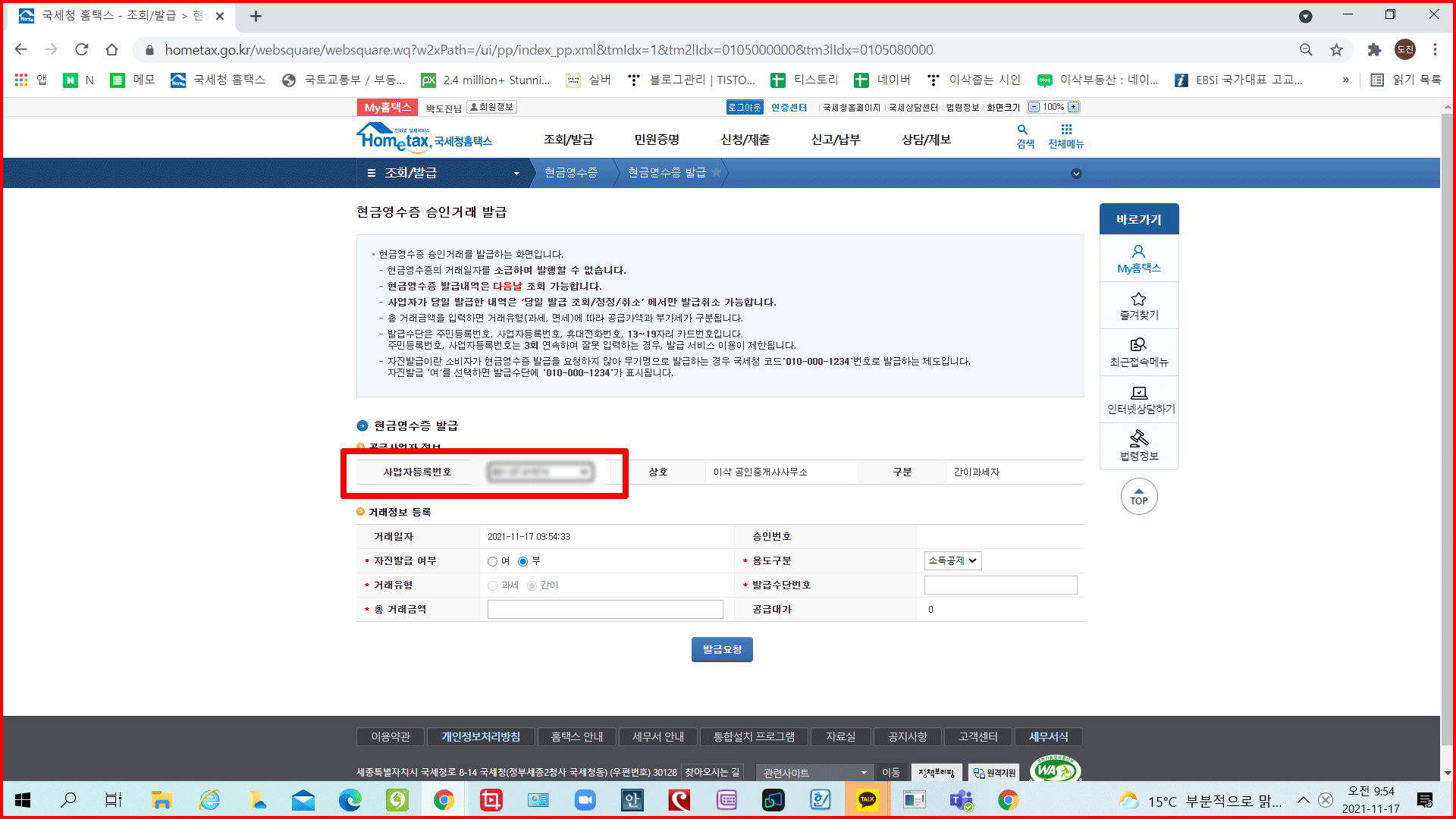 반드시 필요한 사항은 사업자등록번호 선택입니다. 사업자등록번호가 선택되면 상호 등이 자동으로 떠오릅니다. 이미 등록된 내용이라 오른쪽 아래 화살 표시로 선택이 가능합니다.
