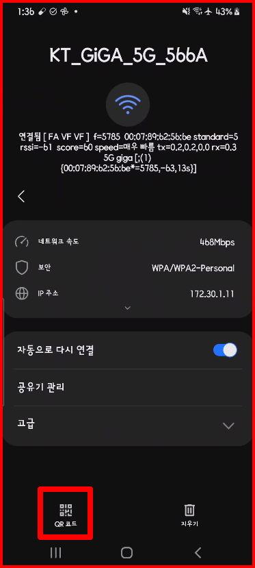 우선 와이파이가 설정된 스마트폰의 와이파이 설정 창을 엽니다. 여기에는 와이파이 연결 정보가 담겨 있습니다. 아래와 같이 [KT_GIGA......]AP에 연결된 정보가 요상한 문자와 함께 나타납니다. 그 아래에 [QR 코드]가 보입니다. 이것을 선택하면 와이파이 설정된 스마트폰의 QR코드가 나타납니다.