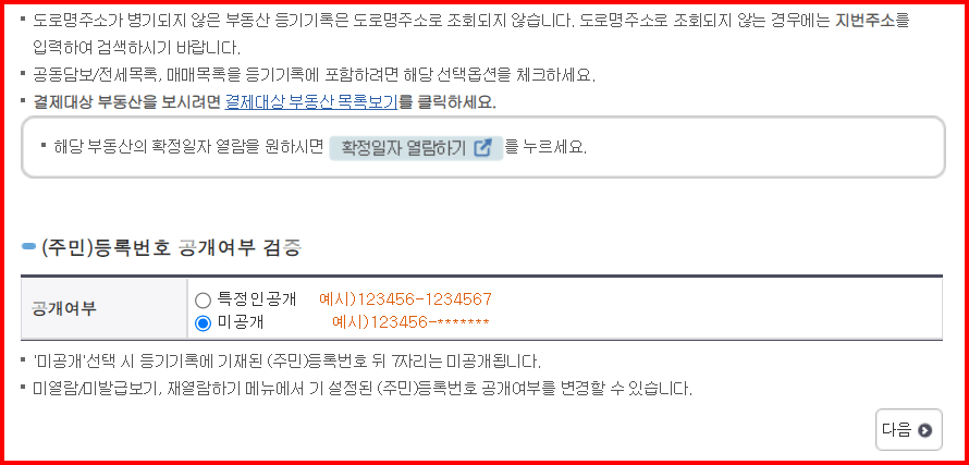 또한 (주민)등록번호 공개 여부도 물어옵니다. 미공개를 선택하면 주민등록번호 뒷자리는 미공개됩니다.