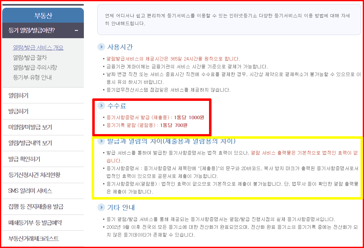 우선 수수료가 있습니다. 열람은 700원, 발급은 1,000원입니다. 열람 발급 서비스의 제공시간은 1년 내내 언제나 가능합니다. 다만 금융기관 계좌이체는 금융기관의 서비스 시간을 기준으로 결제가 가능합니다.