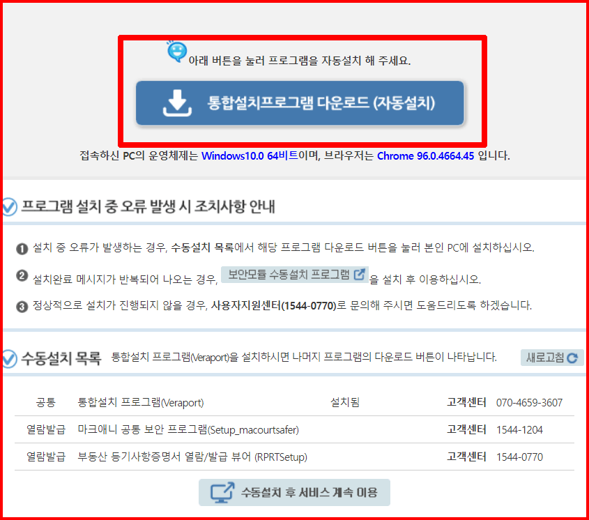 물론 아래와 같은 권장 사항에 따라 자동으로 설치할 수 있습니다. [통합설치프로그램 다운로드(자동설치)]를 선택하면 컴퓨터가 알아서 5개의 프로그램을 설치합니다.