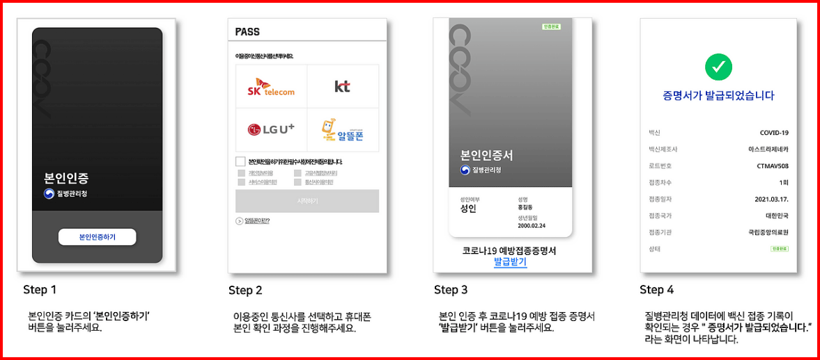 - 본인 인증 후 코로나19 예방 접종 증명서 '발급받기' 버튼 클릭