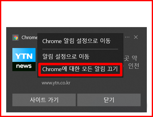 삼점 더보기에서 올라온 팝업창에서 [Chrome에 대한 모든 알림 끄기]를 선택하세요. 그럼 끝.