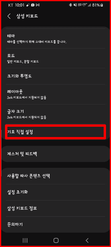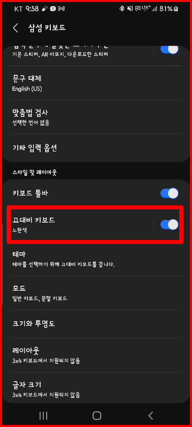 삼성키보드에서는 고대비 키보드를 설정할 수 있습니다. 고대비란 색상을 뚜렷하게 구별하여 키보드 인식을 쉽게 할 수 있는 것을 말합니다. 키보드 설정창에서 [고대비 키보드]를 선택하면 됩니다. 물론 노란색 말고도 다른 색으로 설정할 수 있습니다.