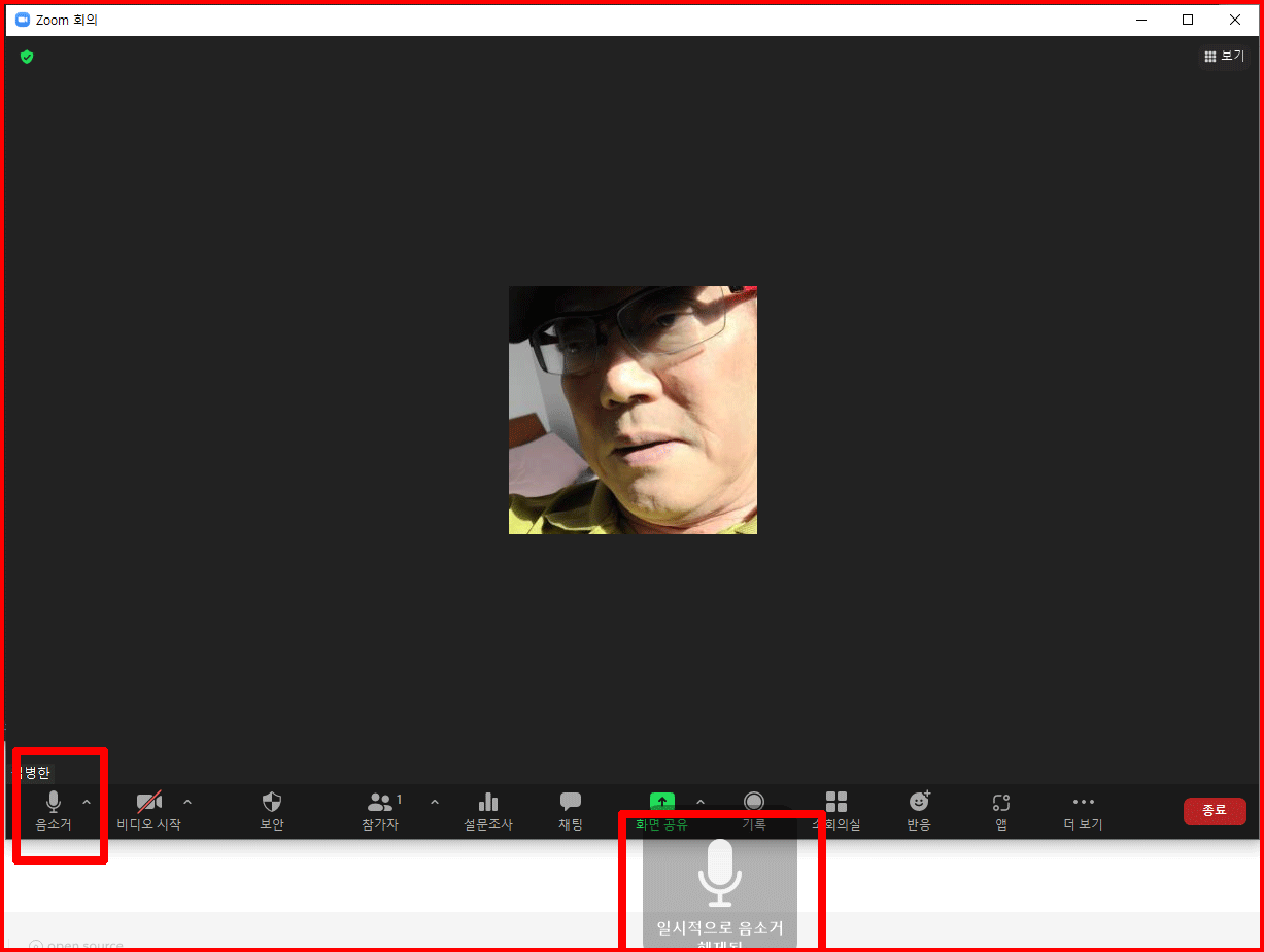 다음 화면은 스페이스바를 눌러 음소거를 해제한 상태입니다. 아래에 [일시적으로 음소거] 됐다는 흐릿한 아이콘이 생기면서 마이크 아이콘이 활성화되어 있는 것을 알 수 있습니다. 회의 참가자는 기본적으로 음소거를 시켰다가 발언할 때 스페이스바를 누르고 말을 하면 됩니다.