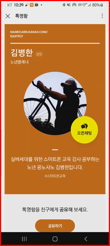 톡명함은 주소가 있습니다. [namecard.kakao.com/life4silver]등으로 공유할 수 있습니다.