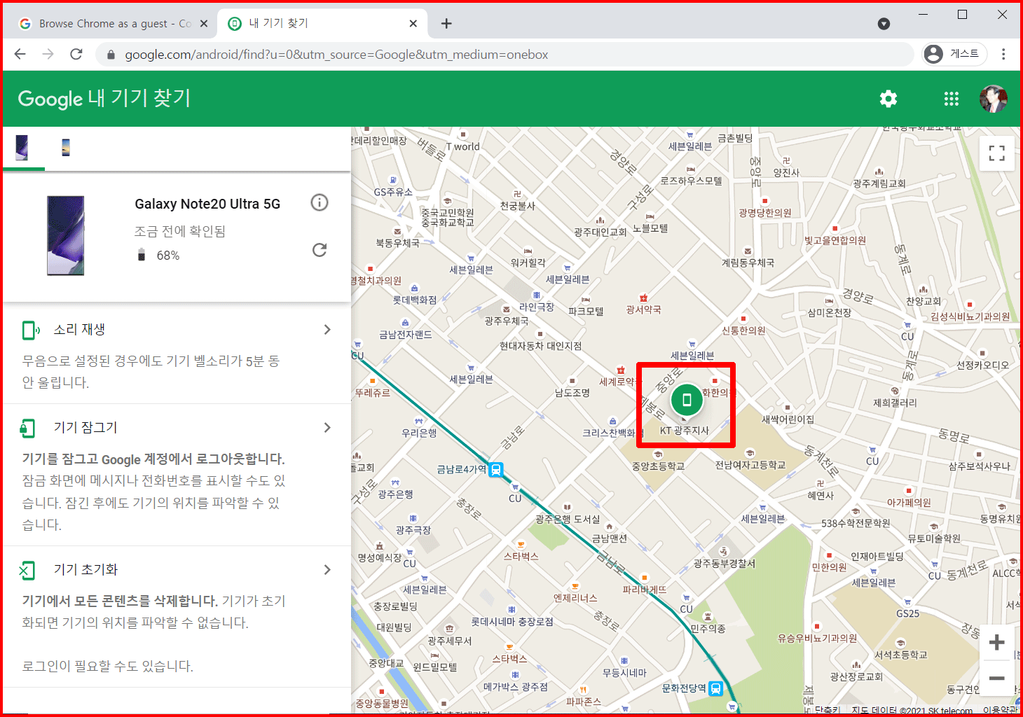 며칠 전 [KT 광주지사]에 두고 온 형님 폰 갤럭시 노트20의 위치를 찾을 수 있었습니다. 물론 형님 지메일로 로그인된 상태에서 찾은 것이죠.