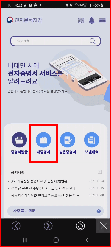 [전자지갑]으로 신속하게 이동하겠습니다. 아~ [전자문서지갑]이군요. 본래 명칭이. 명칭에 '문서'를 포함한 것은 현금 노릇을 하는 그런 기능은 포함되지 않고, 문서를 전자적으로 소지하고 관리하는 것이다,라는 얘기인 듯합니다.