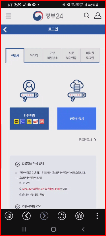 문제는 사용 방법이 쉽지 않다는 것입니다. 이 경우도 인증 방법은 [간편인증]과 [공동인증서]가 있네요. 저는 [공동인증서]를 선택합니다. 모바일에서 [간편인증]은 PC보다는 더 쉽습니다.