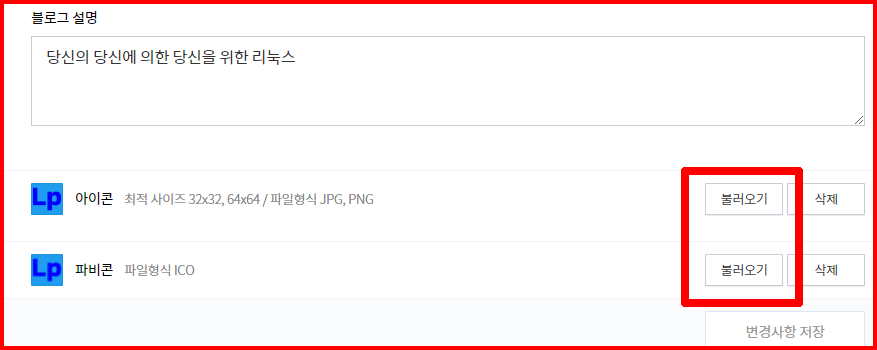 파비콘부터 변경하겠습니다. 파비콘(파일형식 ICO) 불러오기를 선택하여 해당 파일을 선택합니다. 하나밖에 없습니다. 이어서 아이콘 불러오기를 통해 [32 × 32] PNG 파일을 선택했습니다.