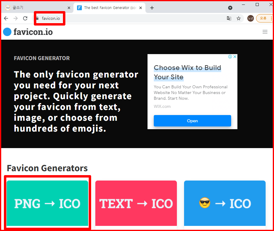 이 사이트에서 파비콘을 쉽게 만들 수 있는데, 3가지 방법이 있습니다. 오늘 만드는 방법은 첫 번째 [PNG → ICO]를 선택합니다. 나머지 두 방법은 이미 포스팅한 티스토리 파비콘 만들기를 참고하세요.