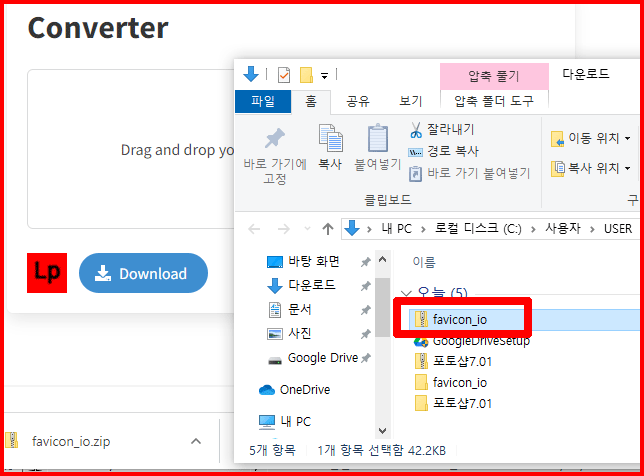 [Download] 버튼 왼쪽에 업로드한 파일 이미지가 보입니다. 이제 다운로드를 합니다. 압축파일 [favicon.io.zip] 파일이 다운로드됨을 확인할 수 있습니다.