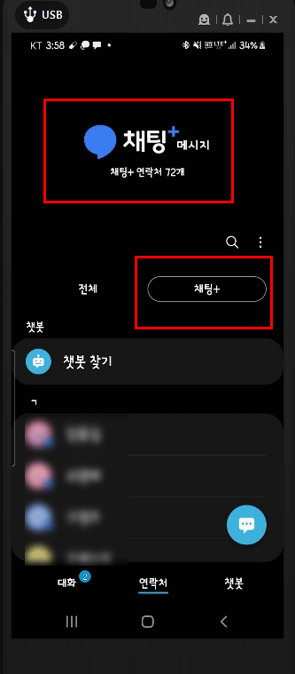 챗봇이라는 항목이 따로 있습니다. 챗봇과 채팅이 가능하려면 [+]를 선택하여 채팅을 허락해야 챗봇과 소통을 할 수 있어요.