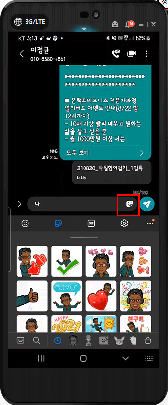메시지 입력란 뒤에 있는 웃는 하얀 아이콘을 선택하면 이모지나 스티커를 선택하여 문자에 추가할 수 있습니다.