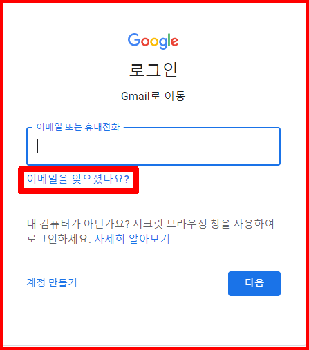 본인 확인을 위한 이메일을 모른다면 '이메일 찾기' 과정으로 진행합니다. '복구 이메일'이란 계정 만드는 과정에서 복구를 위한 이메일을 등록합니다. 그 계정을 의미합니다.