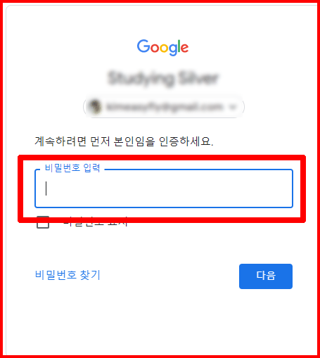 '비밀번호'를 요구합니다. 지금 현재 사용하고 있는 비밀번호를 입력합니다. 만약 비밀번호를 모를 때에는 비밀번호 찾기를 통해 새로운 비밀번호를 설정할 수 있습니다.