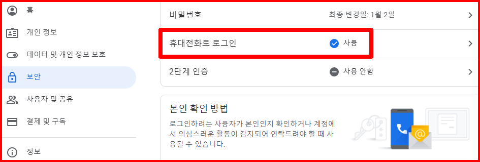 보안 메뉴를 보면 '휴대전화로 로그인' 항목이 '사용'으로 변경됐음을 확인할 수 있습니다. 아래 있는 '2단계 인증'은 사용 안함이 많습니다. '휴대전화로 로그인'과 '2단계 인증'은 둘 중 하나만 적용됩니다.
